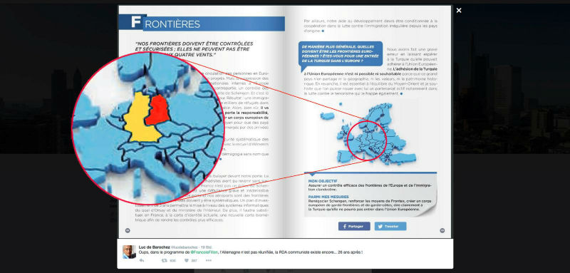 ونشرت حملة فيون، في خطأ أحدث حرجا، خريطة أوروبا في برنامج سياستهم تصور خطا حدوديا يمر بوسط ألمانيا.